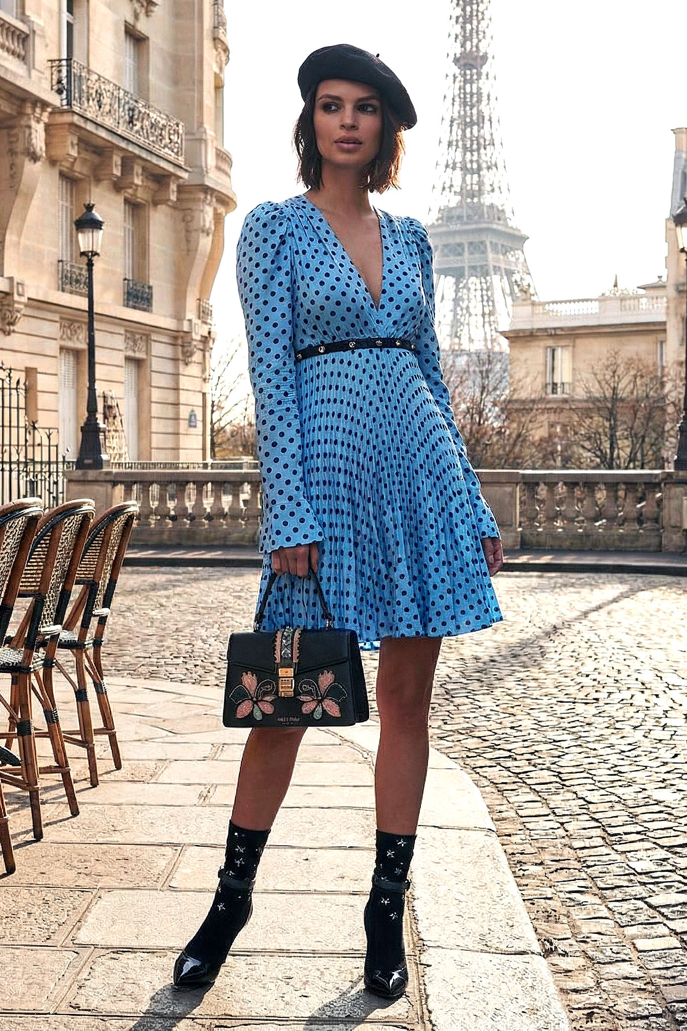 Abito azzurro a pois neri che unisce stile parigino e femminilità romantica in un design allegro e raffinato. Il vestito presenta una vivace stampa pois neri su fondo azzurro cielo che crea un effetto retro-chic senza tempo. La scollatura a V profonda con chiusura centrale esalta il décolleté con eleganza. Le maniche lunghe leggere aggiungono copertura sofisticata, mentre la magnifica gonna plissettata crea movimento fluido e volume romantico ad ogni passo. La cintura elastica nera in vita definisce la silhouette e valorizza il punto vita con contrasto cromatico elegante. Taglio impero slancia la figura.
