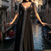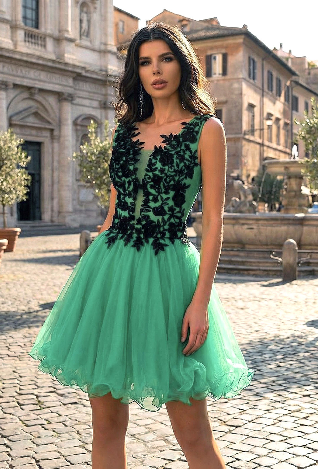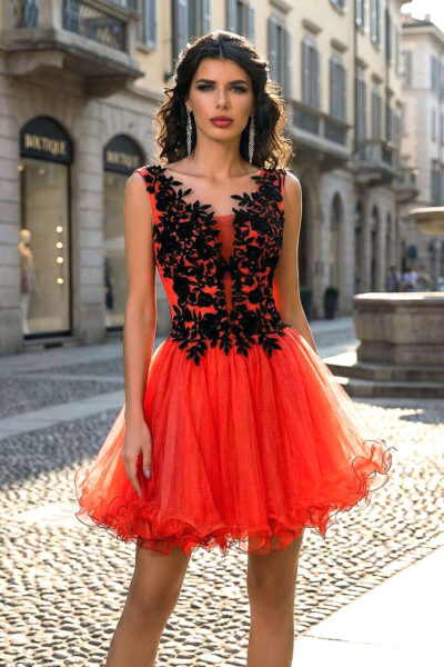 Incantevole abito princess che trasforma ogni donna in una vera principessa moderna. Il vestito in tulle presenta magnifici ricami floreali neri tridimensionali su corpino e spalline che creano un contrasto elegante e sofisticato. La scollatura a cuore con coppe push-up integrate valorizza il décolleté con sensualità. La schiena in tulle trasparente senza fodera è impreziosita da ricami e laccetto regolabile che permette vestibilità personalizzata. L’ampia gonna svasata in tulle con orlo rifinito crea movimento