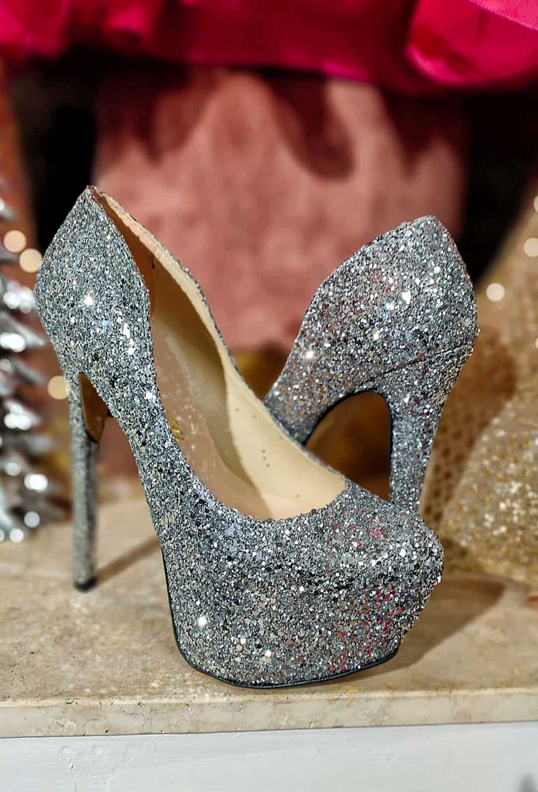 Decolletee con brillantini argento, plateau nascosto e tacco in tinta a spillo da 17cm. Sottopiede morbido realizzato interamente in pelle
