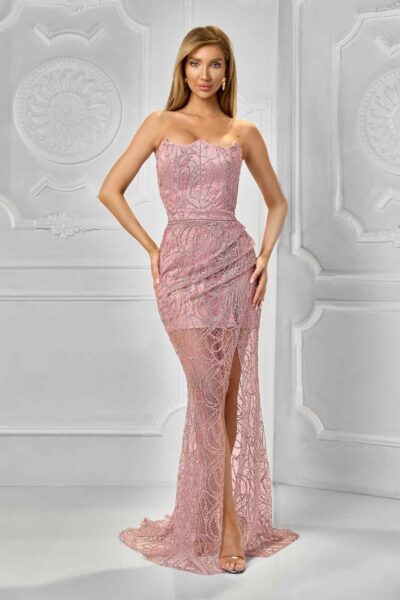 Abito color glicine in tulle ricamato, un capolavoro di eleganza per ogni occasione speciale! Realizzato con un sofisticato tulle ricamato, questo abito da donna presenta una scollatura a punta stile Versace che esalta il décolleté. La sottogonna in raso tinta su tinta dona volume e struttura, mentre lo spacco profondo sulla gamba aggiunge un tocco audace e moderno. Senza coppe, l’abito aderisce perfettamente, con una cerniera posteriore per una chiusura raffinata. Il tessuto non elasticizzato mantiene una linea impeccabile.