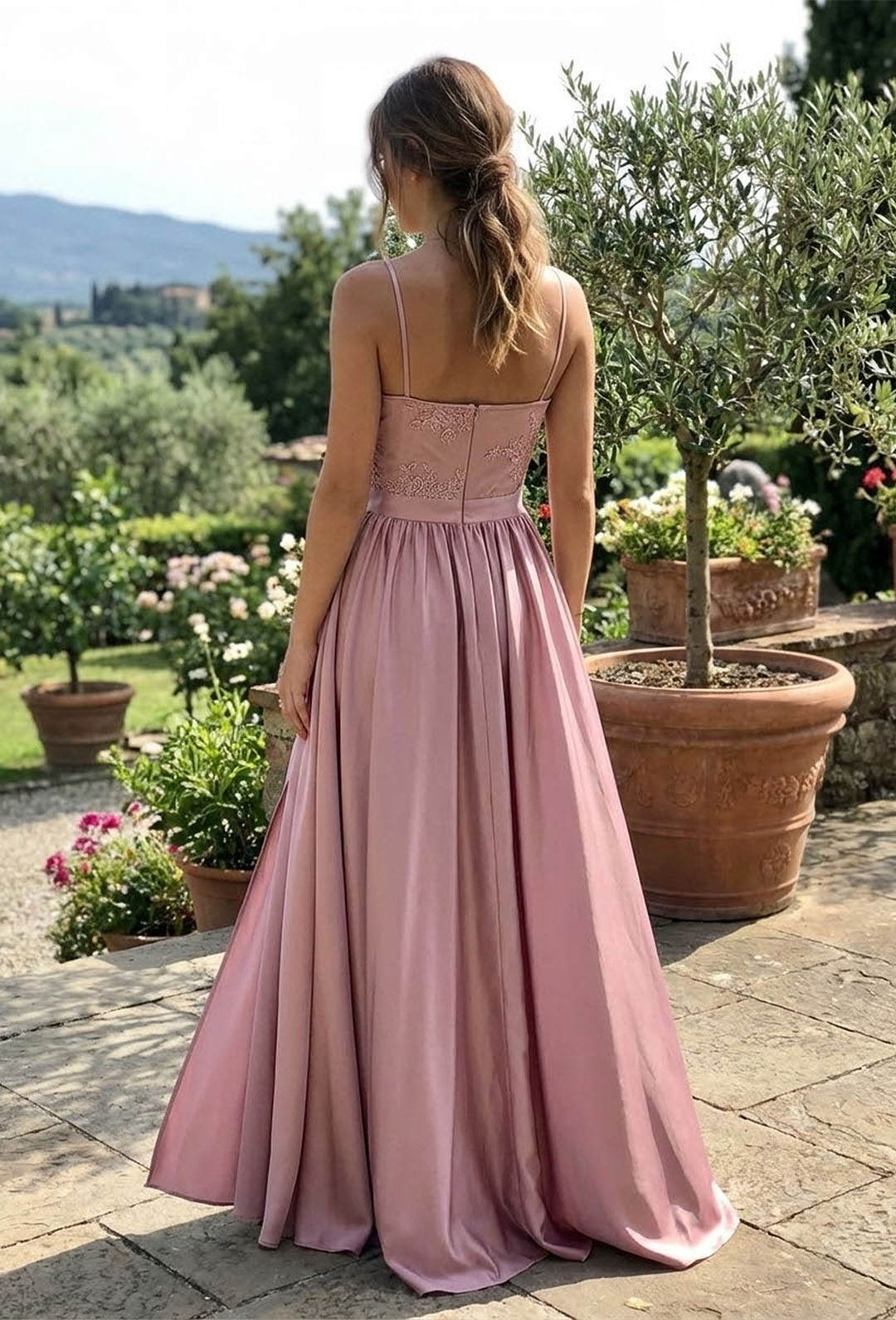 Un abito da cerimonia che è un capolavoro di eleganza e raffinatezza. Realizzato in un delicato raso tipo seta, questo abito presenta un corpino in tulle ricamato che aggiunge un tocco di romantico fascino. Le spalline sottili garantiscono un look femminile e sofisticato, mentre l’assenza di coppe e l’elasticizzazione permettono di indossare questo abito con un reggiseno a fascia senza spalline per una maggiore comodità. La tonalità di colore può variare leggermente da capo a capo, aggiungendo un tocco di originalità. Non esiste modo migliore per distinguersi e sentirsi al meglio in occasione di una cerimonia importante(BELLA)