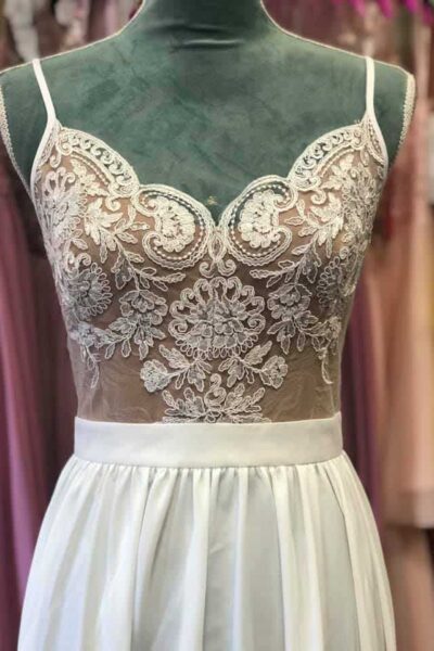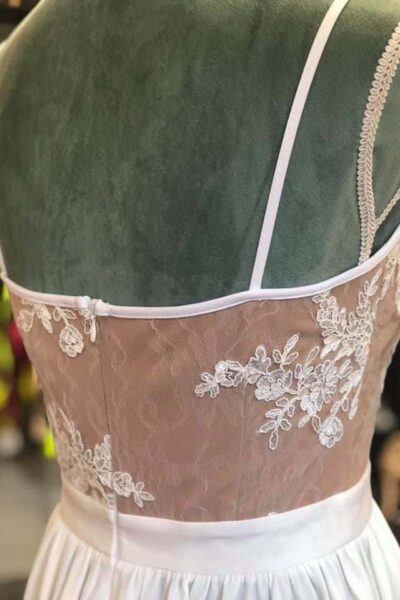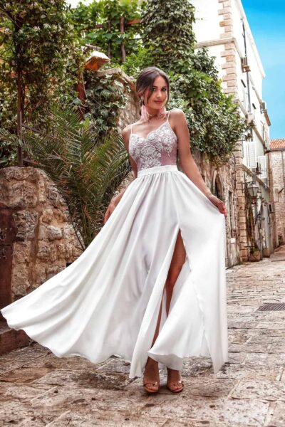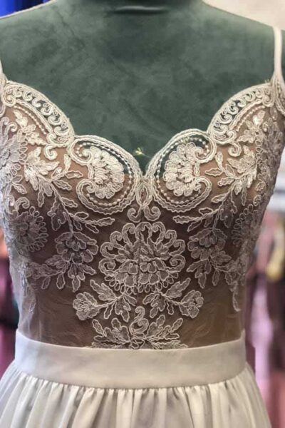 Un abito da cerimonia che è un capolavoro di eleganza e raffinatezza. Realizzato in un delicato raso tipo seta, questo abito presenta un corpino in tulle ricamato che aggiunge un tocco di romantico fascino. Le spalline sottili garantiscono un look femminile e sofisticato, mentre l’assenza di coppe e l’elasticizzazione permettono di indossare questo abito con un reggiseno a fascia senza spalline per una maggiore comodità. La tonalità di colore può variare leggermente da capo a capo, aggiungendo un tocco di originalità. Non esiste modo migliore per distinguersi e sentirsi al meglio in occasione di una cerimonia importante(BELLA)