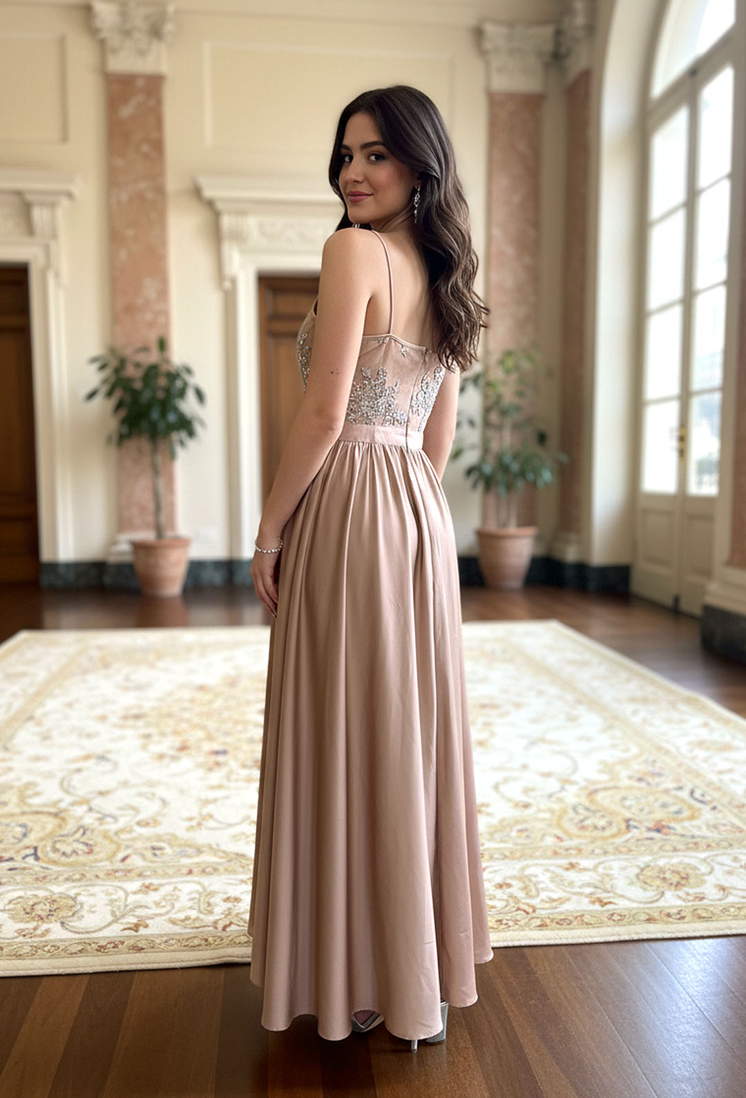 Un abito da cerimonia che è un capolavoro di eleganza e raffinatezza. Realizzato in un delicato raso tipo seta, questo abito presenta un corpino in tulle ricamato che aggiunge un tocco di romantico fascino. Le spalline sottili garantiscono un look femminile e sofisticato, mentre l’assenza di coppe e l’elasticizzazione permettono di indossare questo abito con un reggiseno a fascia senza spalline per una maggiore comodità. La tonalità di colore può variare leggermente da capo a capo, aggiungendo un tocco di originalità. Non esiste modo migliore per distinguersi e sentirsi al meglio in occasione di una cerimonia importante(BELLA)