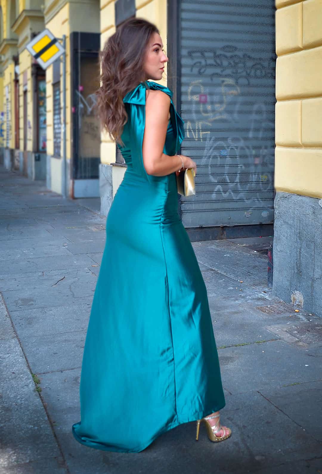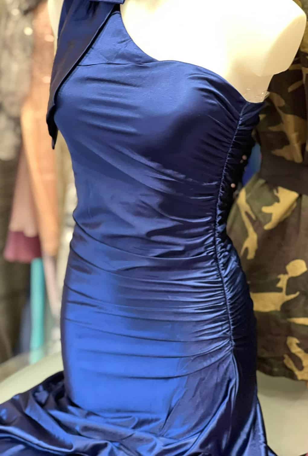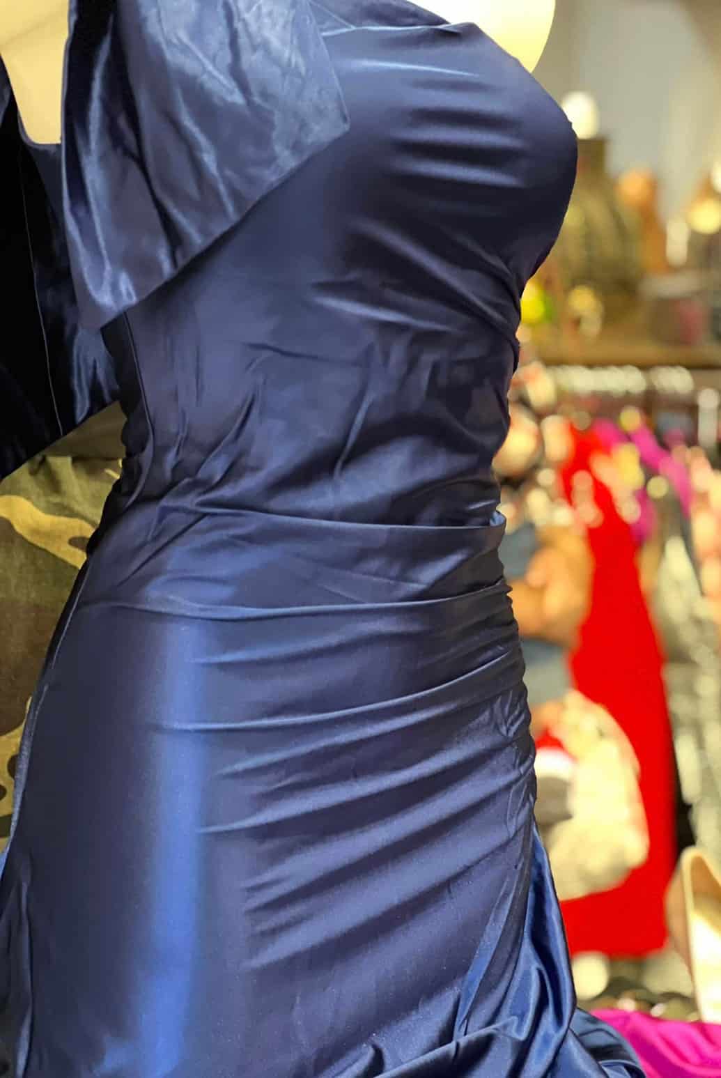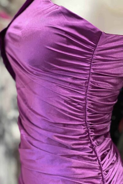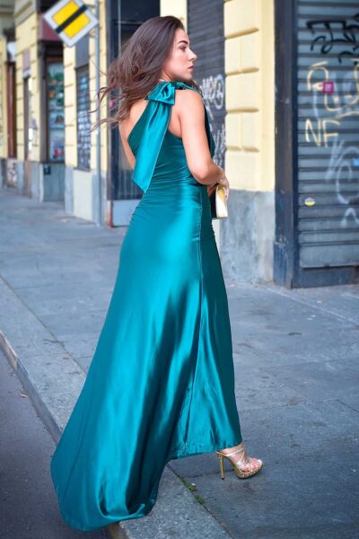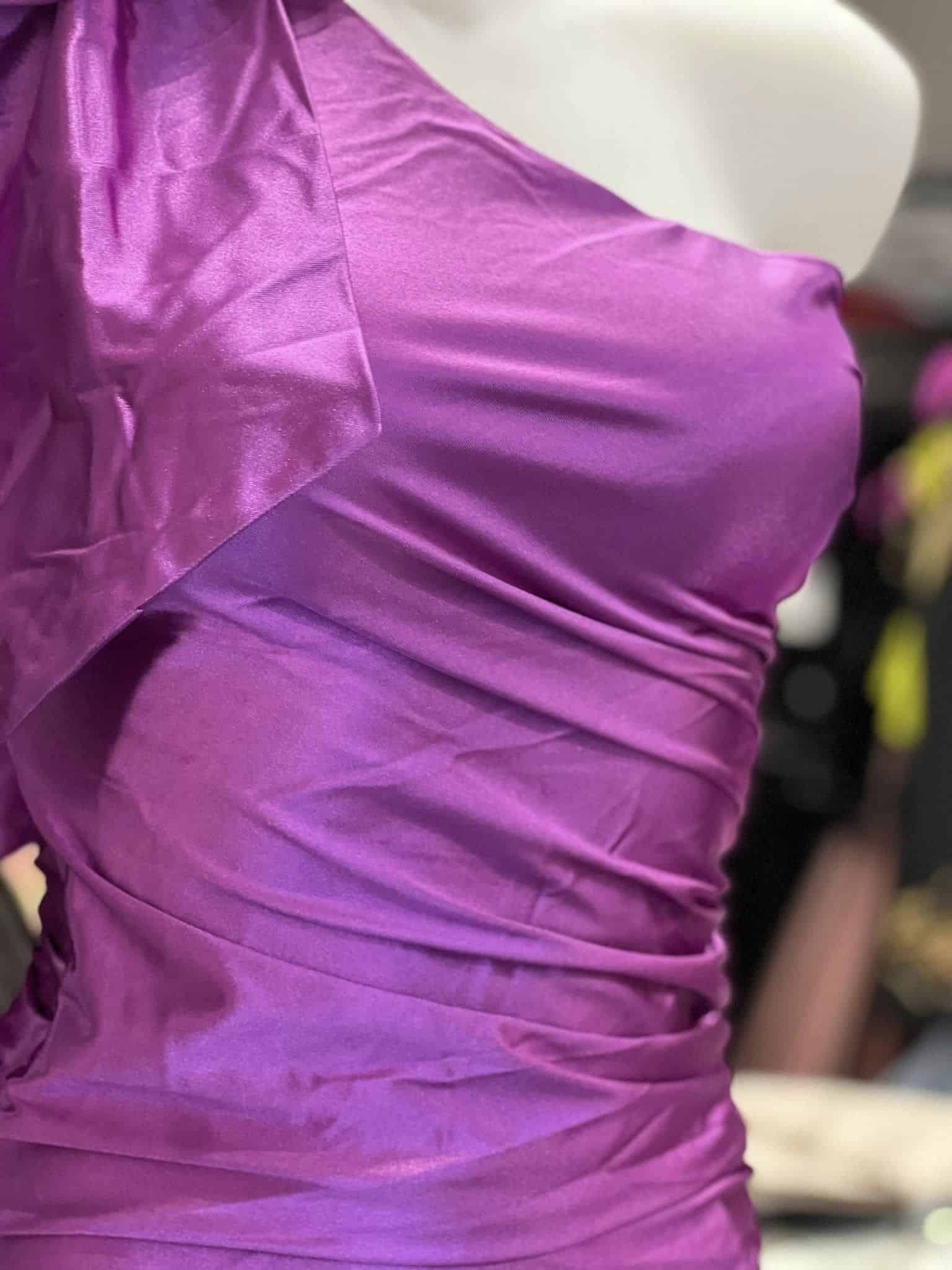 Eleganza e raffinatezza con questo magnifico abito in raso leggermente elastico. Questo capo incanta con il suo design monospalla unico, impreziosito da un grazioso fiocco che aggiunge un tocco di femminilità e stile. La vestibilità aderente di questo abito mette in risalto le tue curve in modo delicato, mentre il tessuto leggermente elastico assicura comfort e libertà di movimento durante tutta la giornata o la serata. La pratica cerniera laterale rende facile indossarlo, garantendo una vestibilità impeccabile.