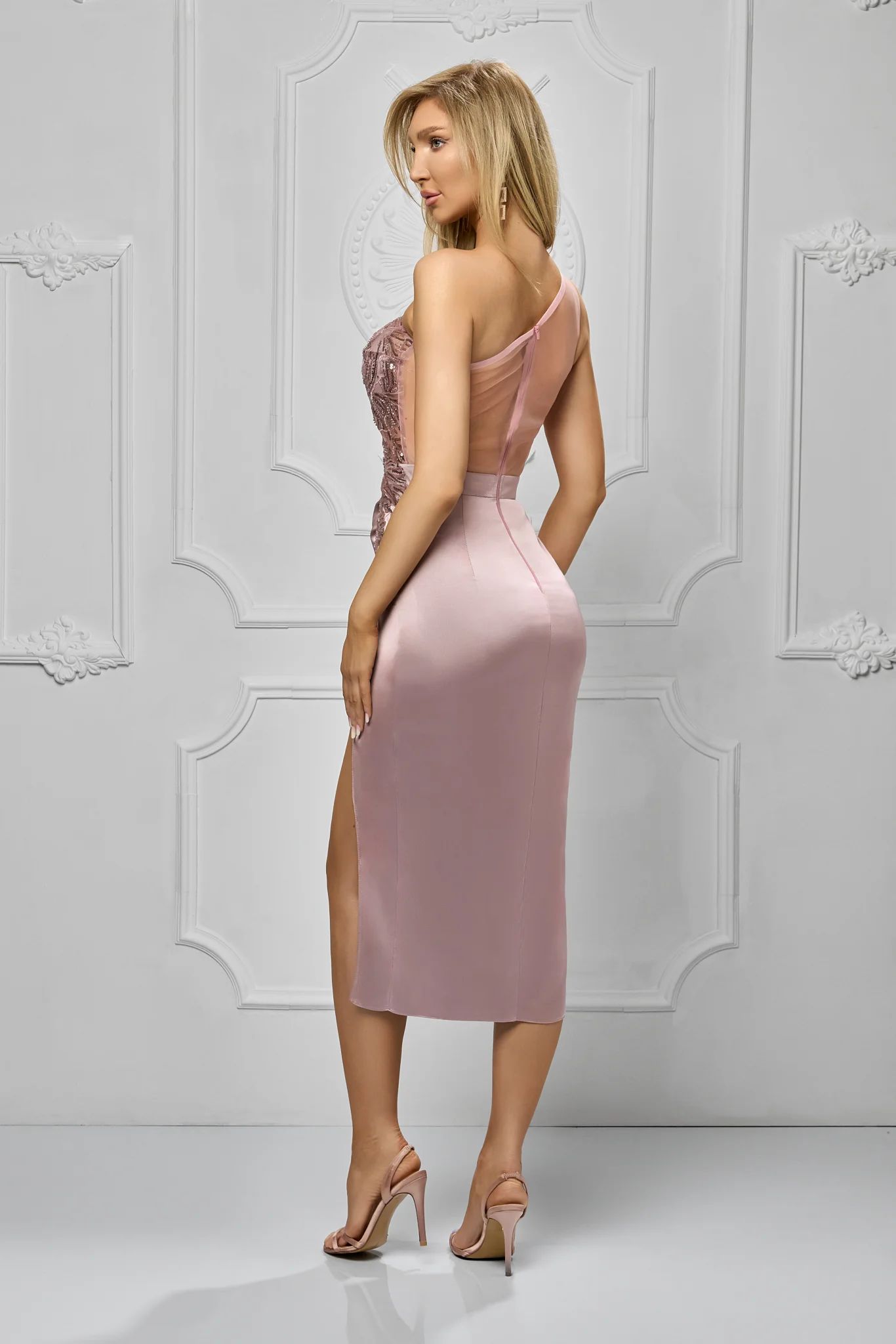 Questo abito mono spalla è un vero capolavoro sartoriale, pensato per esaltare la figura femminile. La parte superiore presenta un corpino in pizzo finemente ricamato con paillettes, che aggiunge un tocco di luce e glamour. Il design mono spalla è impreziosito da una rosa decorativa tridimensionale, un dettaglio di grande impatto visivo. Le coppe leggermente imbottite assicurano un supporto ottimale e una forma impeccabile, permettendoti di indossare l’abito con sicurezza e comodità. La gonna in raso rosa cade morbida ed elegante, culminando in uno spacco profondo sulla gamba, che aggiunge un elemento di sensualità e libertà di movimento. Il tessuto liscio e lucido del raso dona un effetto satinato lussuoso.