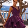 Elegante abito svasato con balze e corpino in tulle ricamato con piccole paillettes .L’abito ha una cerniera posteriore com chiusura e la stessa scollatura che c’è sul petto c’è anche sulla schiena. NON ELASTICIZZATO.La tonalità del tessuto può essere leggermente diversa