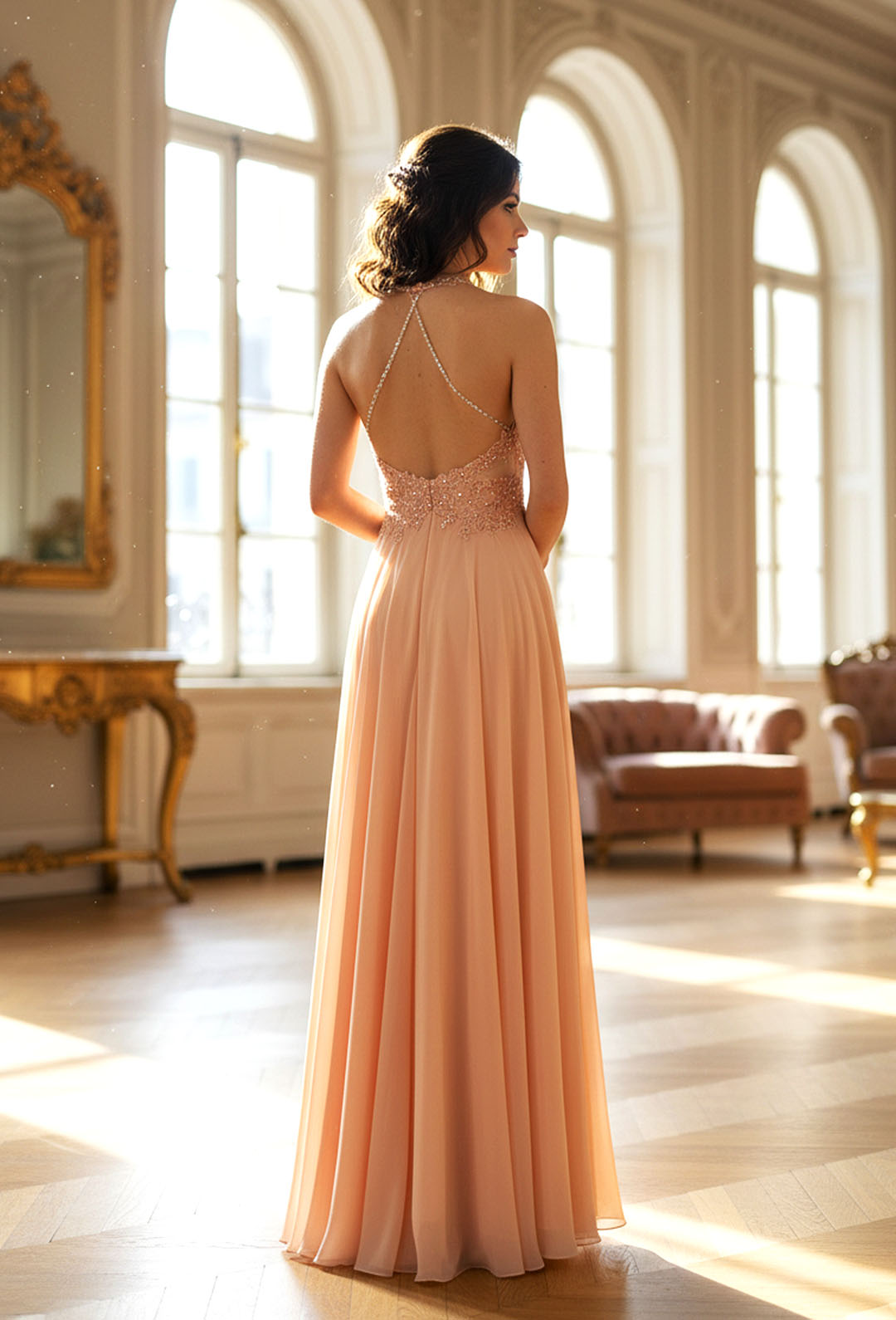 Abito svasato elegante, un concentrato di femminilità e luce progettato per le occasioni più esclusive. Il design di questo abito da sera è caratterizzato da uno straordinario gioco di volumi e punti luce. Il corpetto è impreziosito da sottili bretelle con strass scintillanti che incorniciano le spalle e conducono lo sguardo verso una sensuale schiena scoperta, dettaglio che dona un’aura aristocratica e seducente. Per assicurare una vestibilità perfetta e un décolleté impeccabile, il top è dotato di coppe leggermente imbottite, garantendo sostegno e definizione senza rinunciare alla naturalezza. La parte inferiore dell’abito esplode in una gonna svasata e velata, composta da strati di tessuto leggero che creano un movimento fluttuante, sostenuti da una lussuosa fodera in raso tinta su tinta che assicura coprenza e una lucentezza serica. Il tessuto è volutamente non elasticizzato, una scelta tecnica che conferisce al capo una struttura rigida e pregiata, mantenendo la silhouette definita per tutta la durata del tuo evento. La chiusura è rifinita con una cerniera posteriore a scomparsa per un fit pulito e sartoriale.