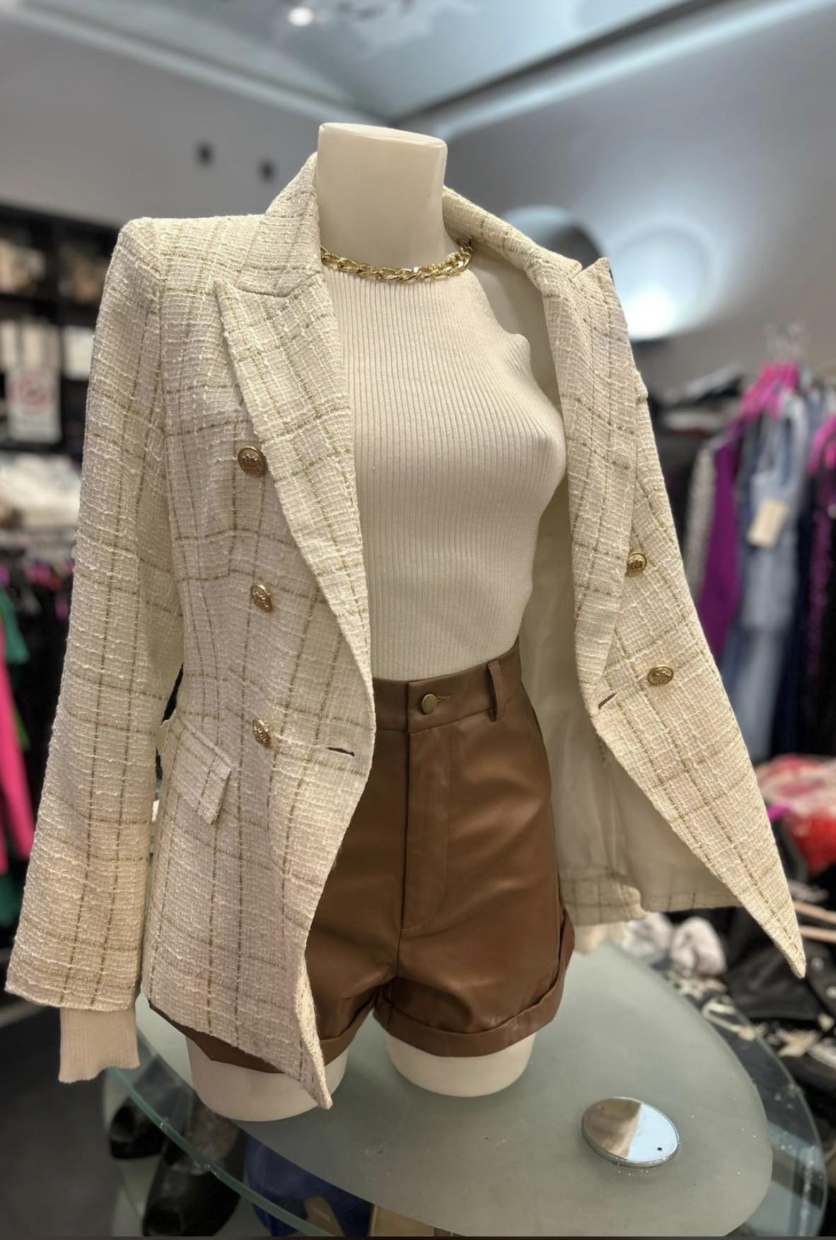Elegante giacca in tessuto bianco bouclé realizzata in un taglio aderente a doppiopetto con bottoni decorativi oro.