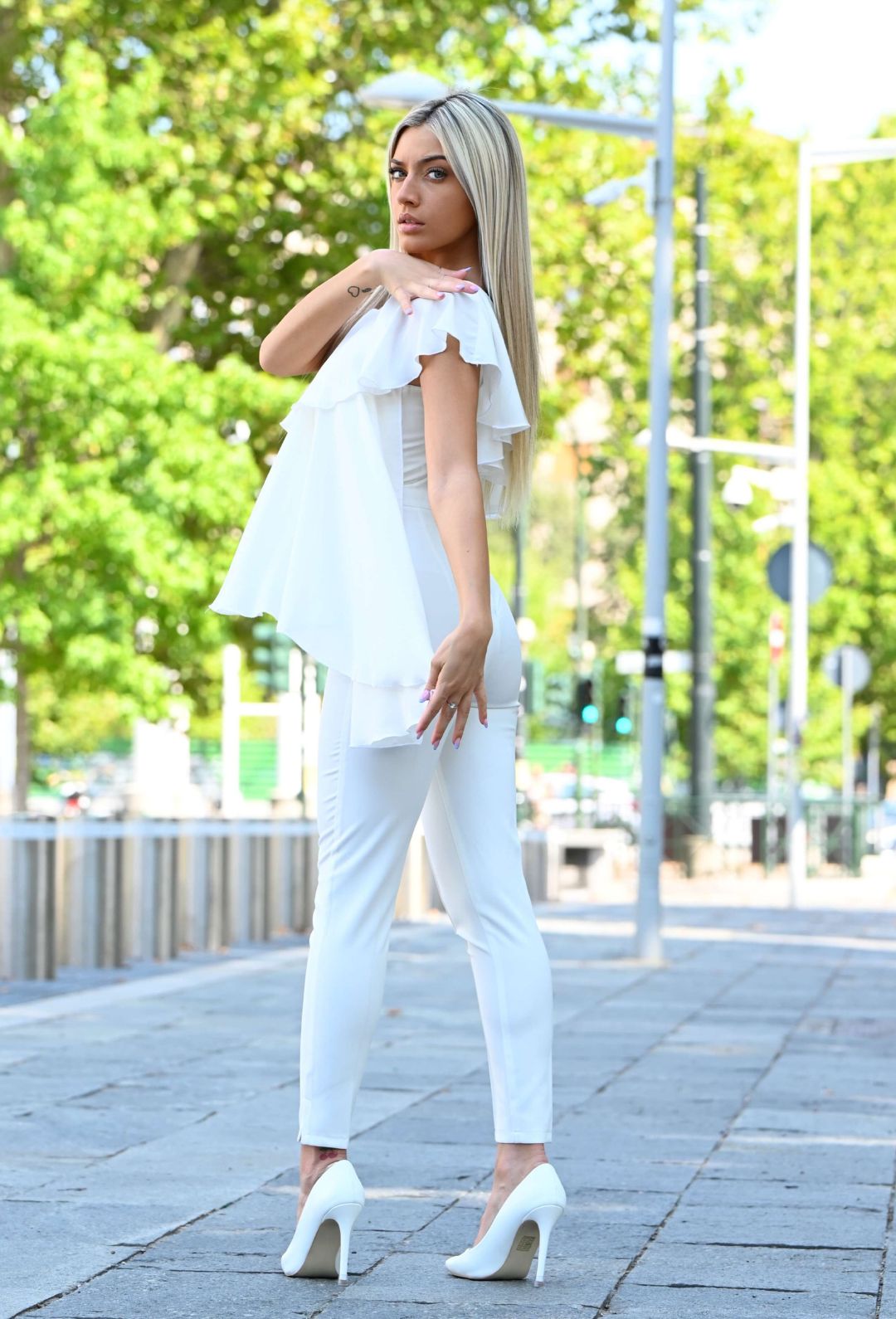 Elegante tuta in tessuto bianco con balze sul corpino , pantalone a vita alta in tessuto tipo cotone non elasticizzato.