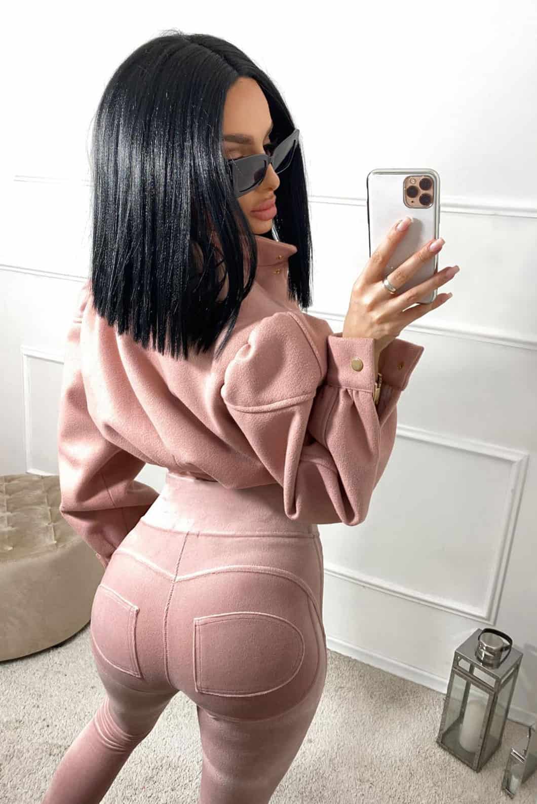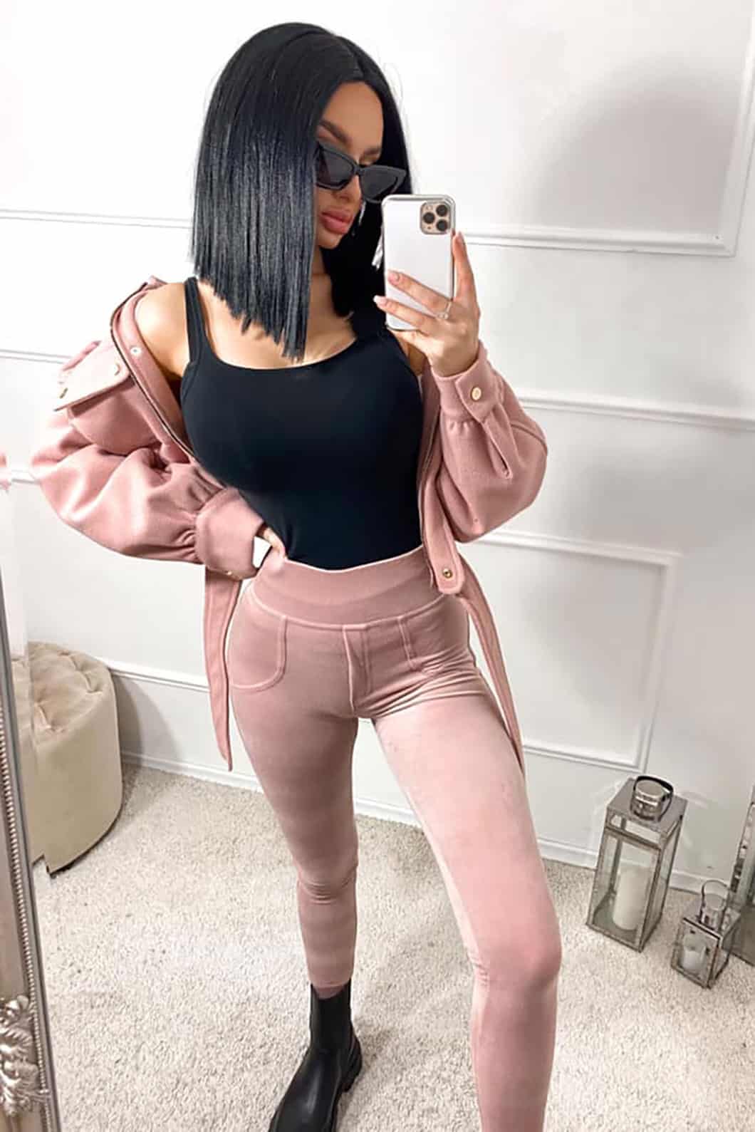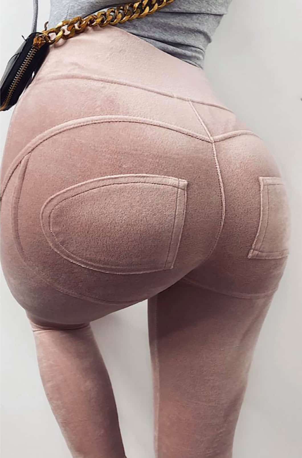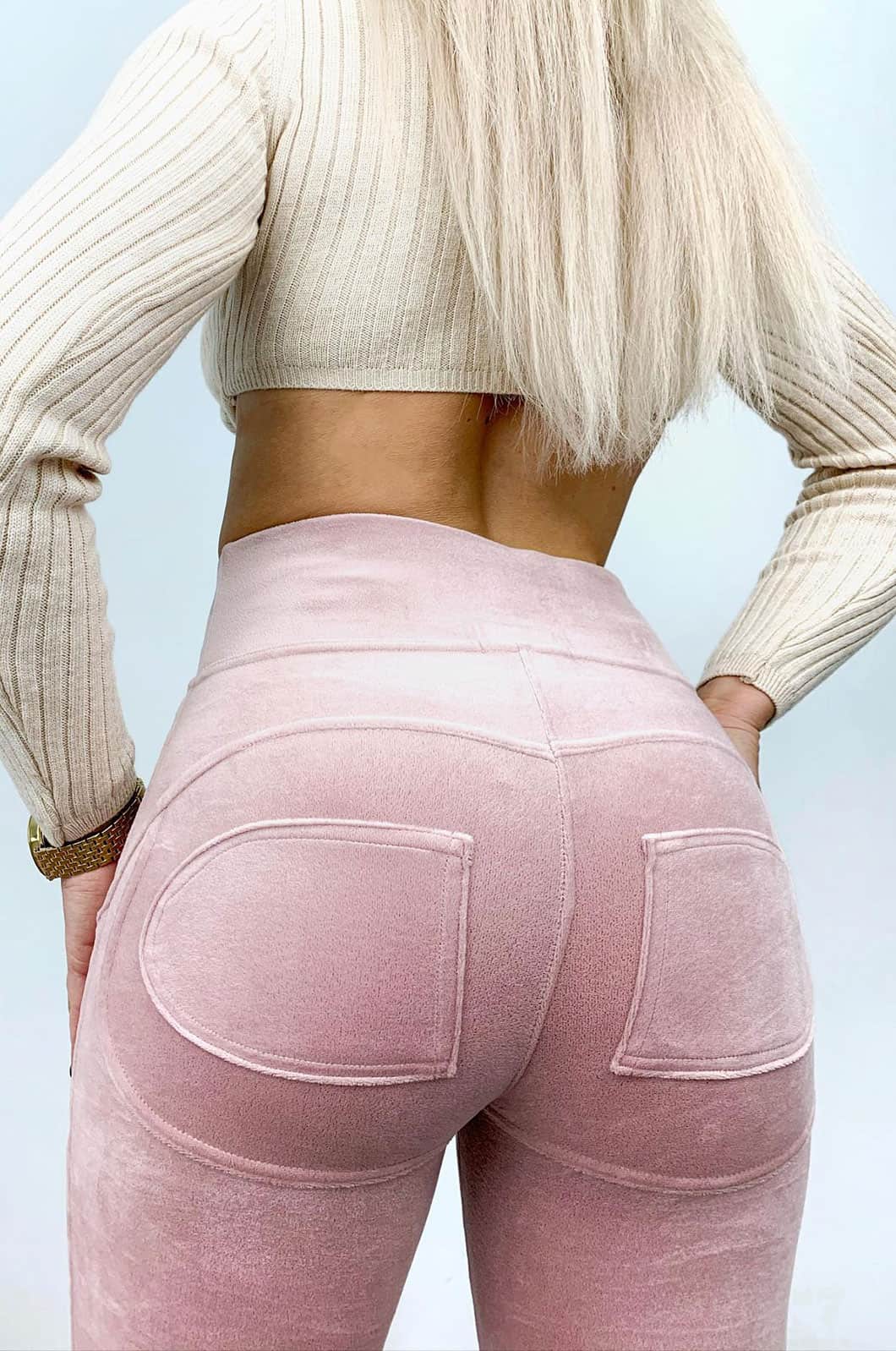 Pantaleggings ad effetto push-up in ciniglia elasticizzata rosa realizzati in un modello a vita alta con fascia e finte tasche .