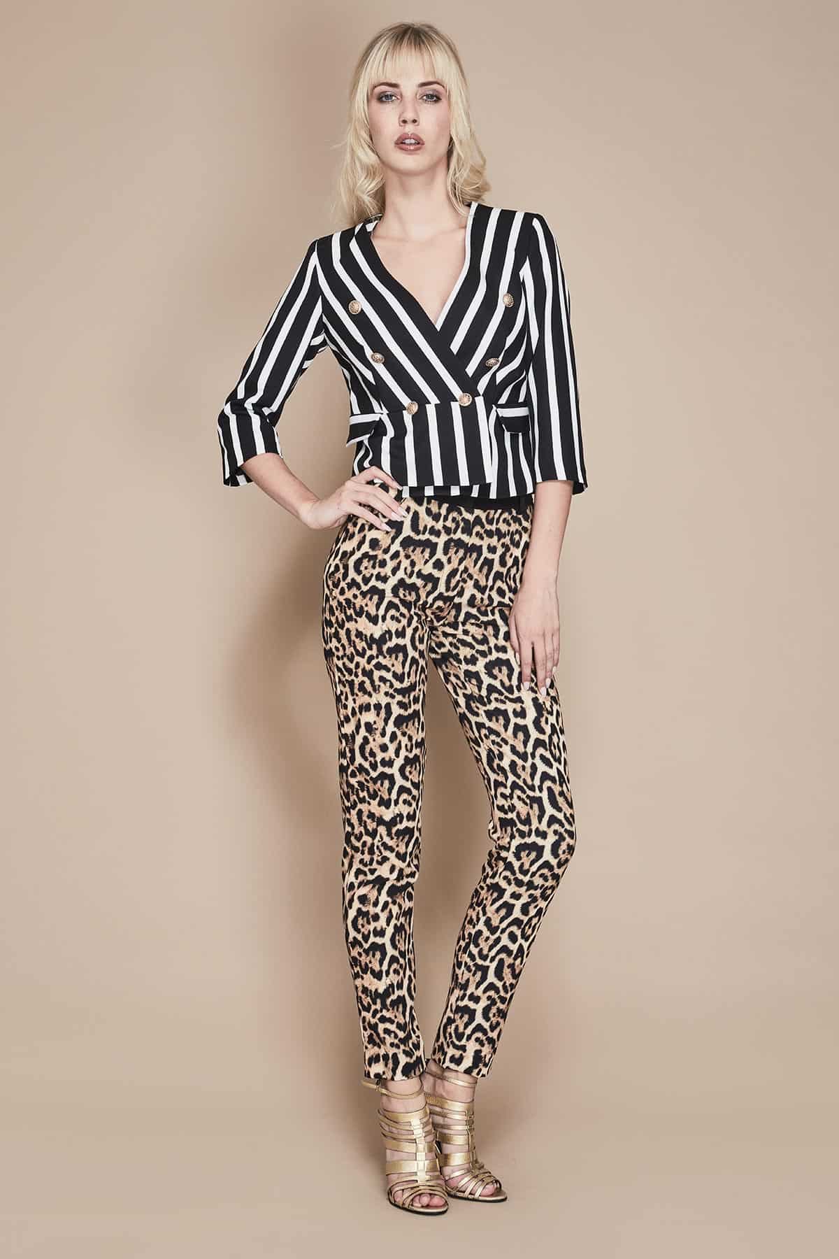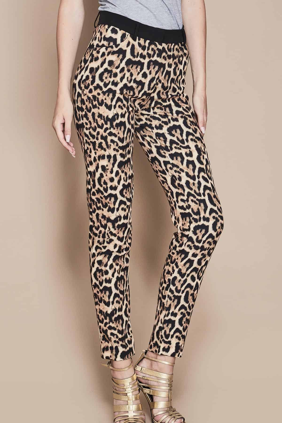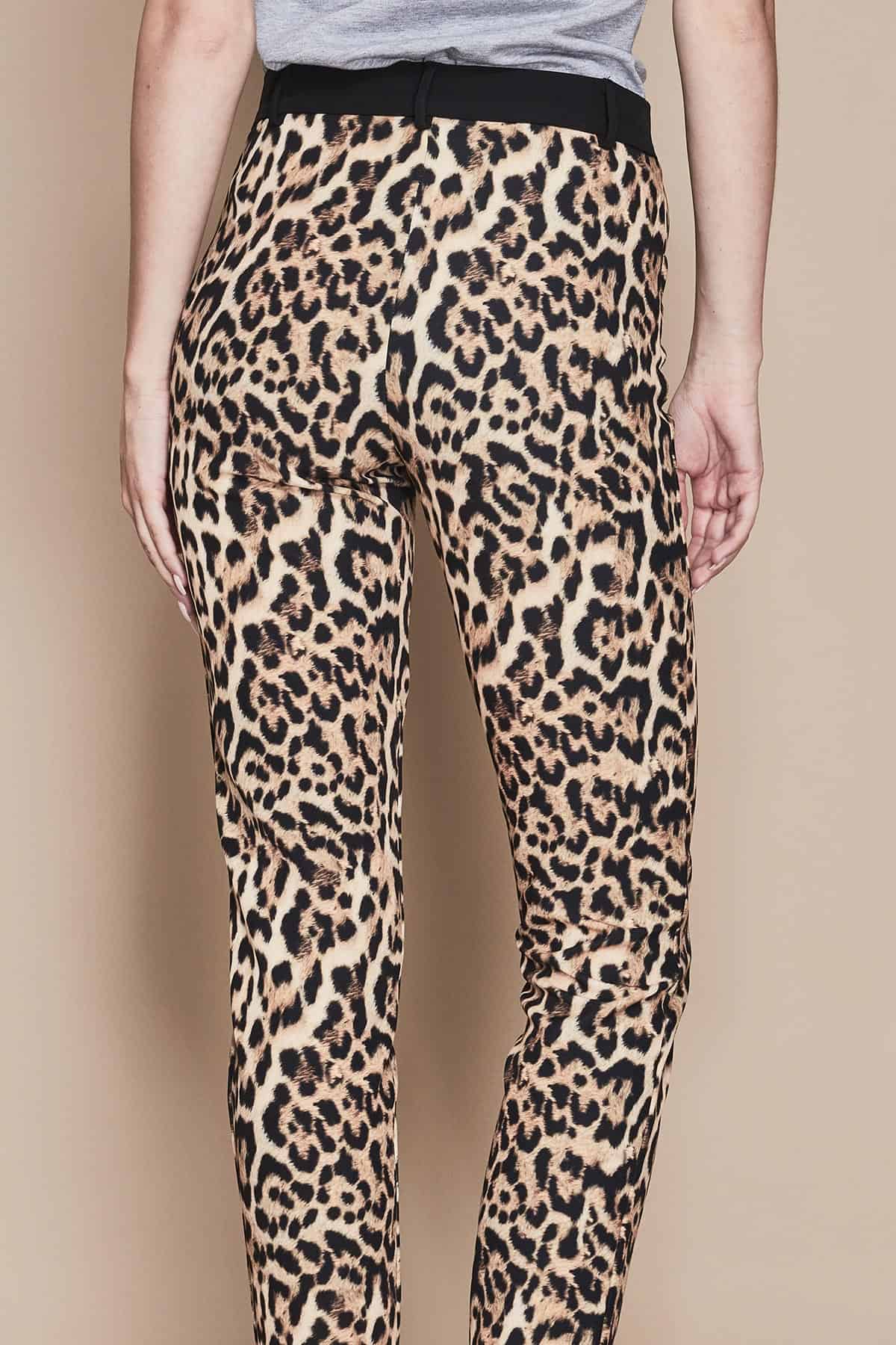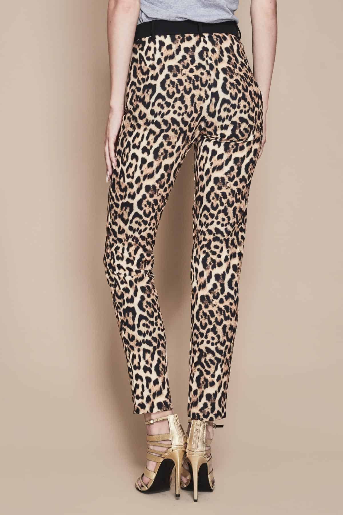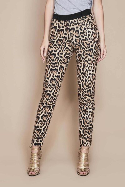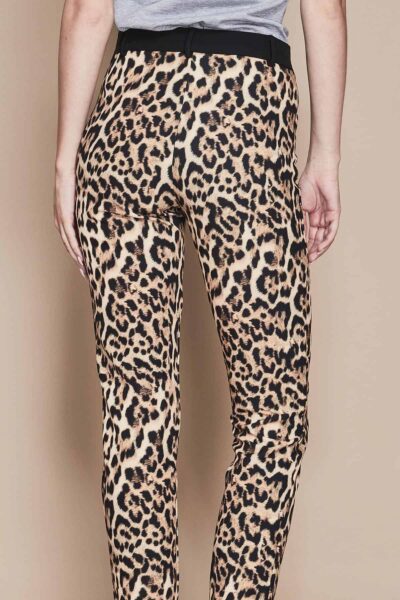Pantaloni a sigaretta in tessuto maculato, realizzati con materiali di alta qualità, perfetti per chi cerca un capo unico e di tendenza. La stampa maculata marrone si abbina perfettamente ad una vasta gamma di colori, rendendoli adatti ad ogni occasione, dall’ufficio al tempo libero. La fascia nera in vita aggiunge un tocco di stile in più, mentre la vestibilità non elasticizzata garantisce un fit perfetto e confortevole.