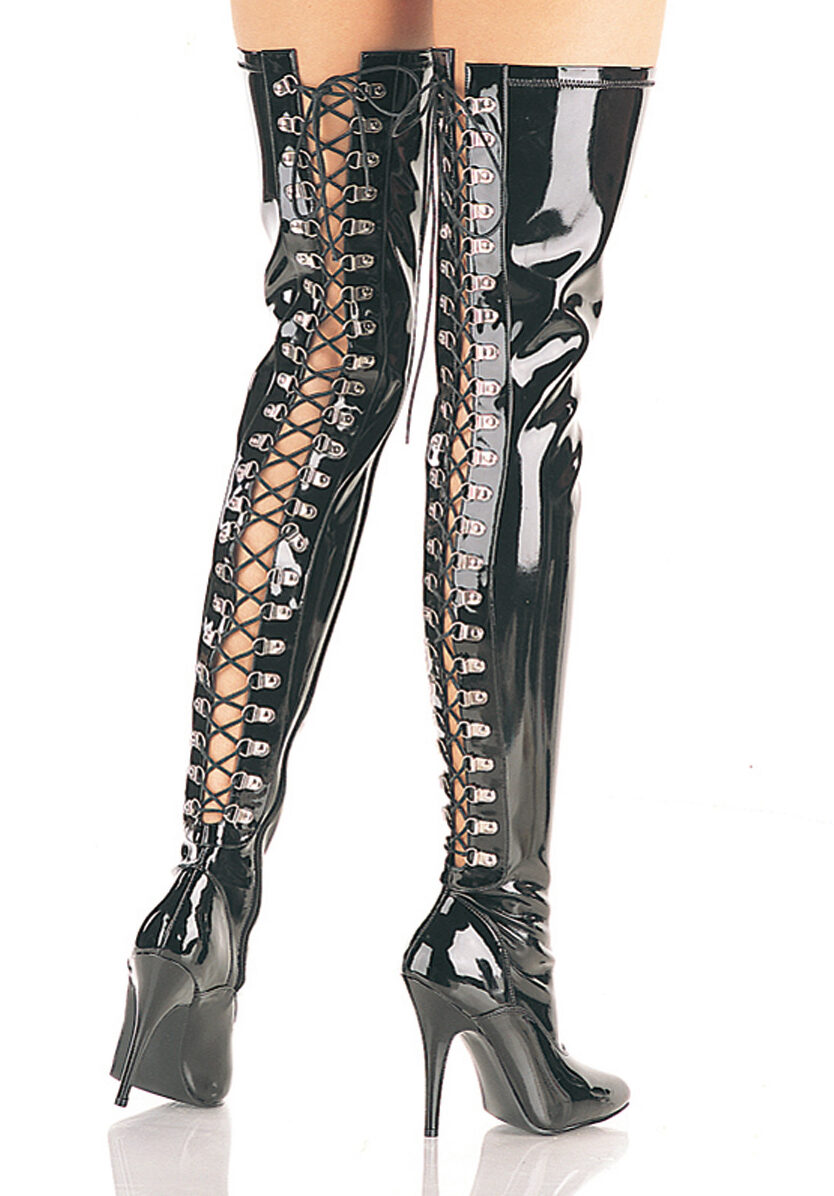 Stivale alla coscia con occhielli regolabili e lacci , tacco 12 cm .
