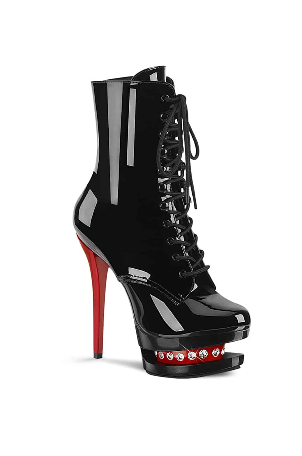 Stivaletto in vernice bicolore con strass,tacco 15 cm ,cerniera laterale e lacci regolabili frontali