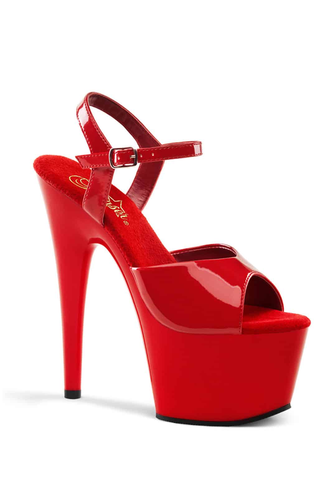 Sandalo in vernice rossa con laccetto alla caviglia , tacco 17,5 cm e plateau 7 cm
