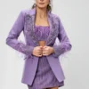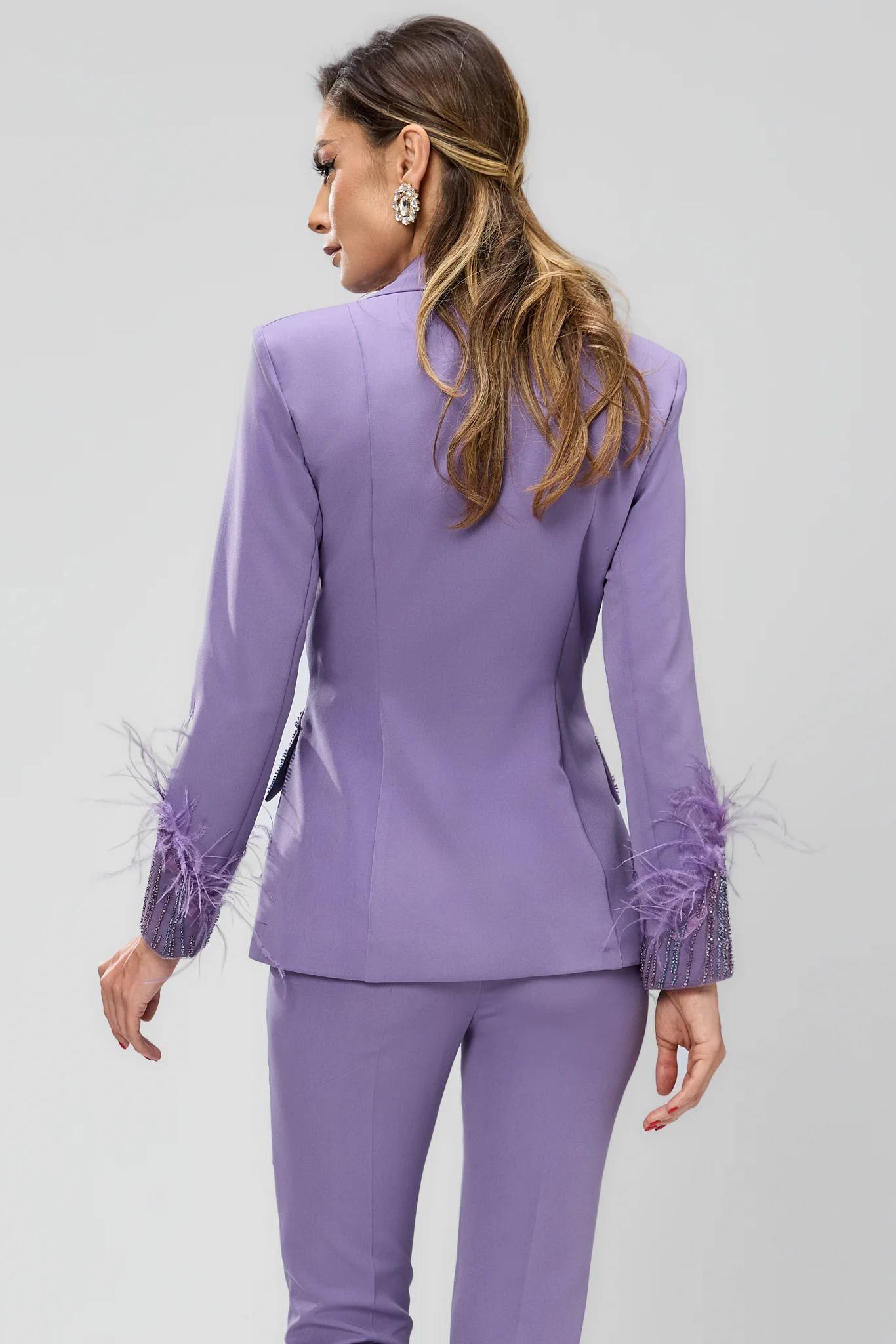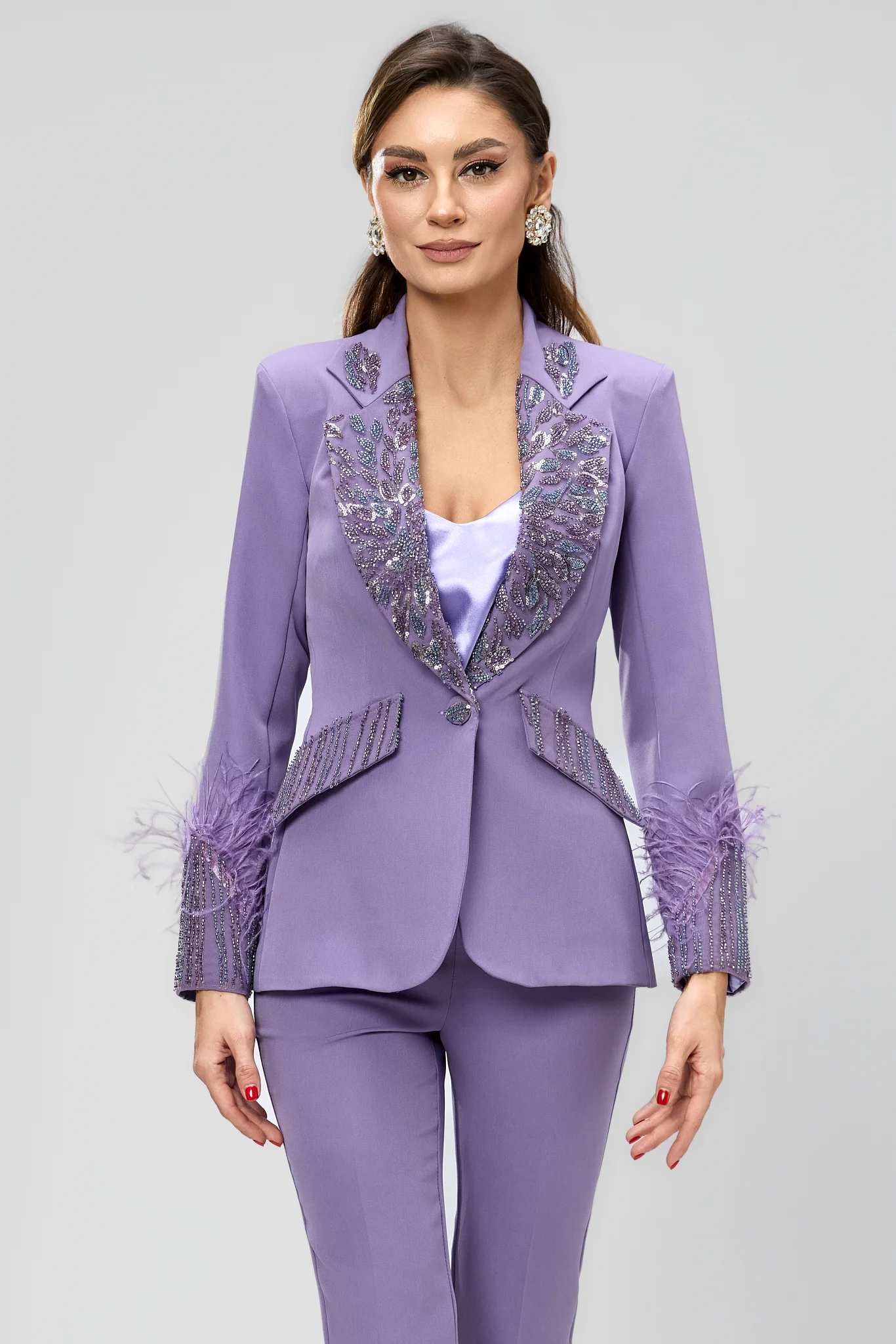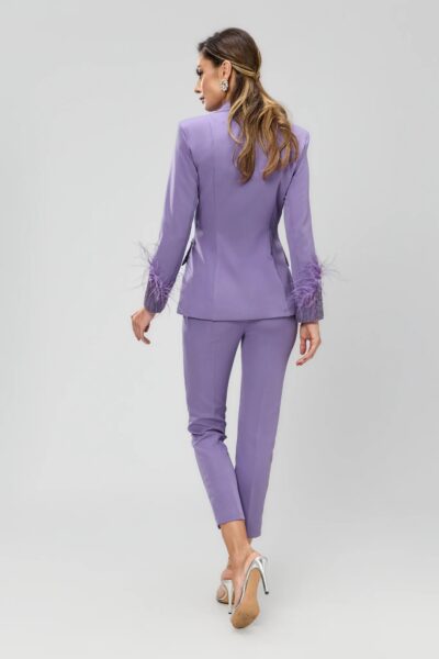 Esclusivo tailleur lilla realizzato in tessuto non elasticizzato: un completo dal design raffinato pensato per chi desidera distinguersi con eleganza e personalità. La giacca monopetto presenta ricami preziosi, arricchiti da applicazioni in piume che aggiungono un tocco glamour e ricercato. I pantaloni a sigaretta, dal taglio asciutto, completano il look con una vestibilità impeccabile, perfetta per eventi serali, cerimonie o occasioni importanti.